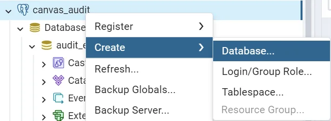 - In the tree view on the left, right-click the open space, then choose Create new > Database.