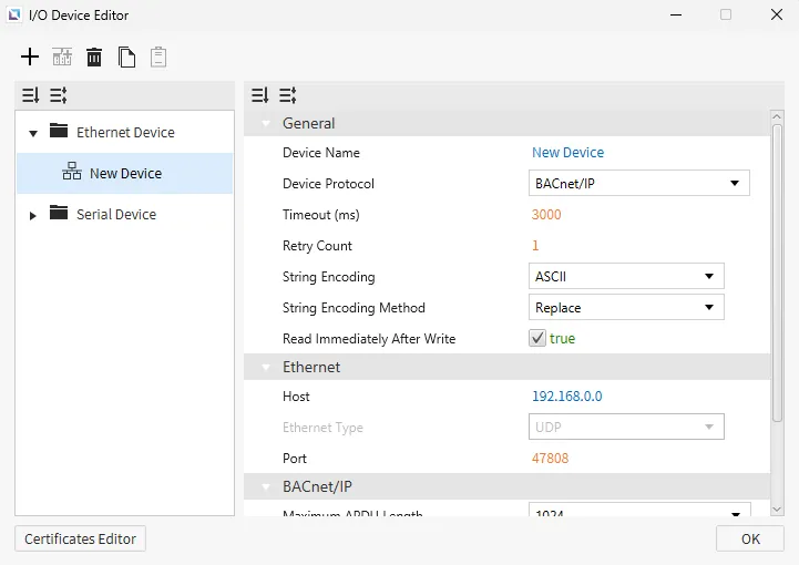 Section titled “BACnet/IP”Canvas supports BACnet/IP Ethernet communication. Users can configure the Maximum APDU Length, Use Read Property Multiple, Maximum Items per Request, and Write Request Priority.