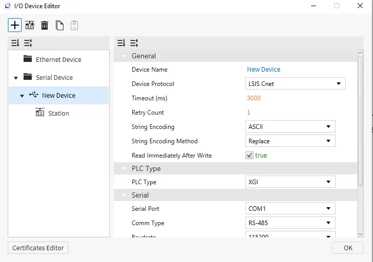 Section titled “Supported Drivers”Serial Devices are used when a connection to another device is made via a serial cable. Users will need to input the Serial Port of the device they are connecting to, the Comm Type, and the Baudrate. Users can also select the String Encoding and the String Encoding Method. Users can also change settings such as the Timeout time, Retry Count, and Transmission Delay. Users will also be able to change the name of the Device and the Protocol of the device as well.