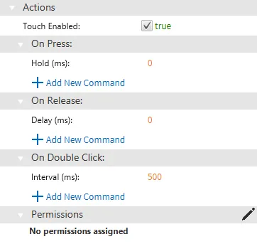 Section titled “Actions”If the action button is pressed, released, or double-clicked, the button runs a script or command. This is controlled under the On Press, On Release, or On Double click section of the Actions tab.
