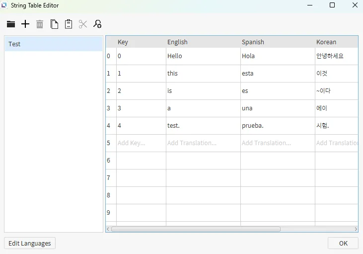 Section titled “String Table Configuration”- Open the String Table Editor. Change the name of the group from "New Group" to "Test" and copy the table provided in the screenshot.