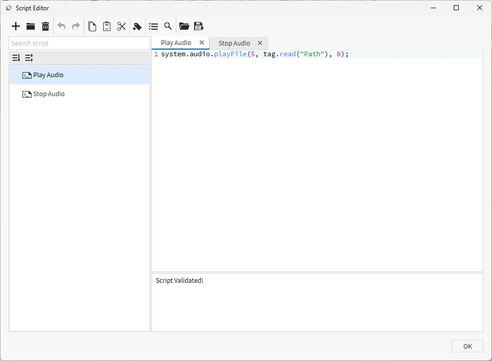 Section titled “Script Configuration”- Create the following scripts: 3. Play Audio - Running type: Manual 4. Stop Audio - Running type: Manual