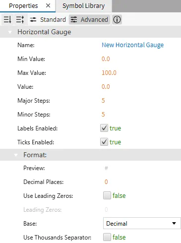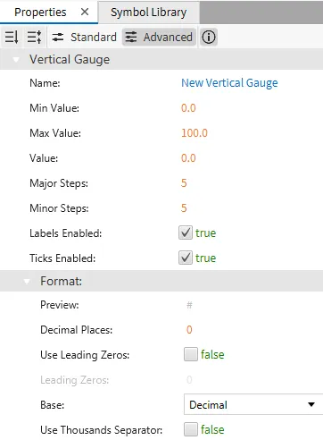Section titled “Basic Properties”Properties like Min Value, Max Value, and Value define the operational range of the gauge. The gauge can also be customized with major and minor step divisions, enabling more detailed value representation. Labels and ticks can be enabled or disabled based on user preferences.