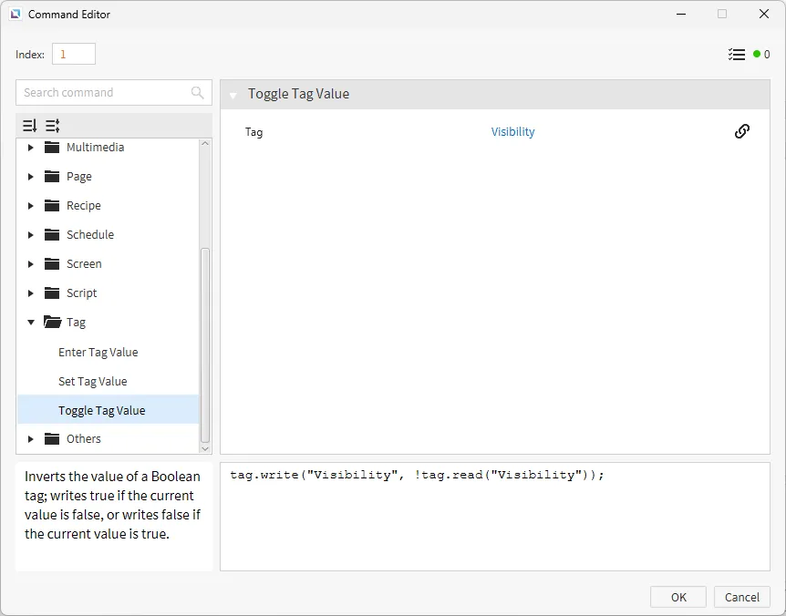 Finally, click on "Edit Visibility", then click on the Actions property. Create a new On Press command. Select Toggle Tag Value and bind the Visibility tag.