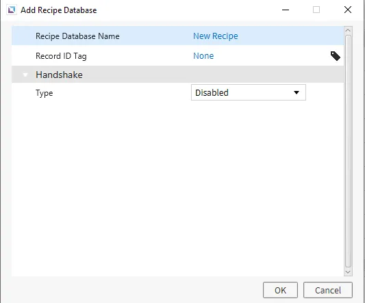 Section titled “Add / Edit Recipe Database”Clicking the + icon on the Recipe Editor, or Edit Recipe, will open a pop-up window to create a new Recipe Database. Here, users can set the recipe's name and the tag to which the record ID will be stored. The record ID allows users to navigate different records within the recipe easily. Users also have the option to enable handshake.