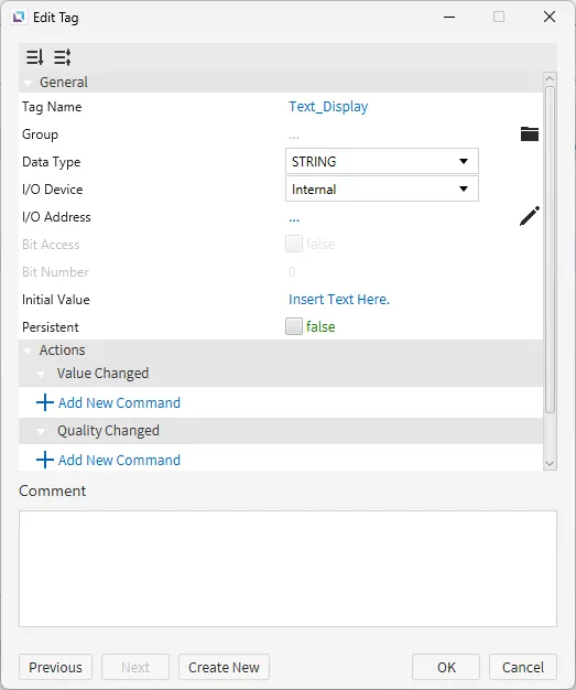- Change the value of the Text_Display tag to “Tag bound to Text.” The text in the box should also change to indicate that the tag was bound correctly.