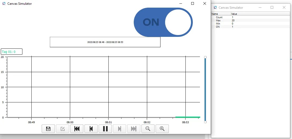 var invert = false; // Decides if the value should increase or decreasethread.msleep(100); // Waits for Lamp tag to updatewhile (tag.read("ON")) { // While Lamp tag is On (1) tag.write("Count", invert ? tag.read("Count") - 1 : tag.read("Count") + 1); // If Invert is false, Add 1 to Count tag, if invert is true, Subtract 1 from Count tag thread.msleep(500); // Waits for Count tag to update if (tag.read("Count") < tag.read("Min")) {tag.write("Count", tag.read("Min"))} // Assigns Min to Count if Count is less than Min else if (tag.read("Count") > tag.read("Max")) {tag.write("Count", tag.read("Max"))} // Assigns Max to Count if Count is greater than Max thread.msleep(500); // Waits for Count tag to update if (tag.read("Count") == tag.read("Min") || tag.read("Count") == tag.read("Max")) {invert = !invert} // Inverses the invert var if Count has reached Max or Min.}