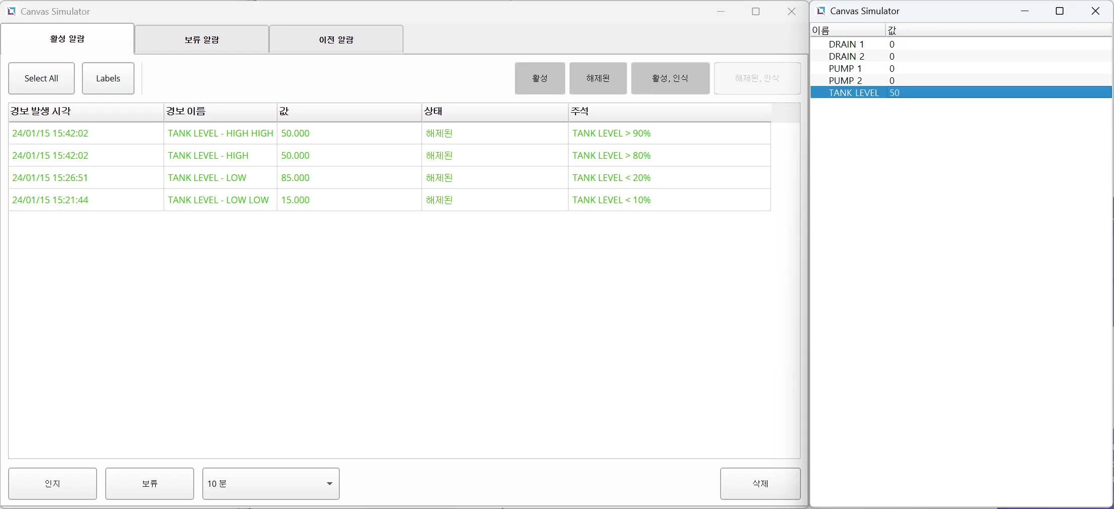 - TANK LEVEL 태그 값을 85로 설정하면 TANK LEVEL - LOW 경보가 해제되지만 TANK LEVEL - HIGH 경보가 활성화 되며 ON 동작에 설정된 명령에 의해 PUMP 1태그는 0으로, DRAIN 1 태그의 값이 1이 됩니다.
