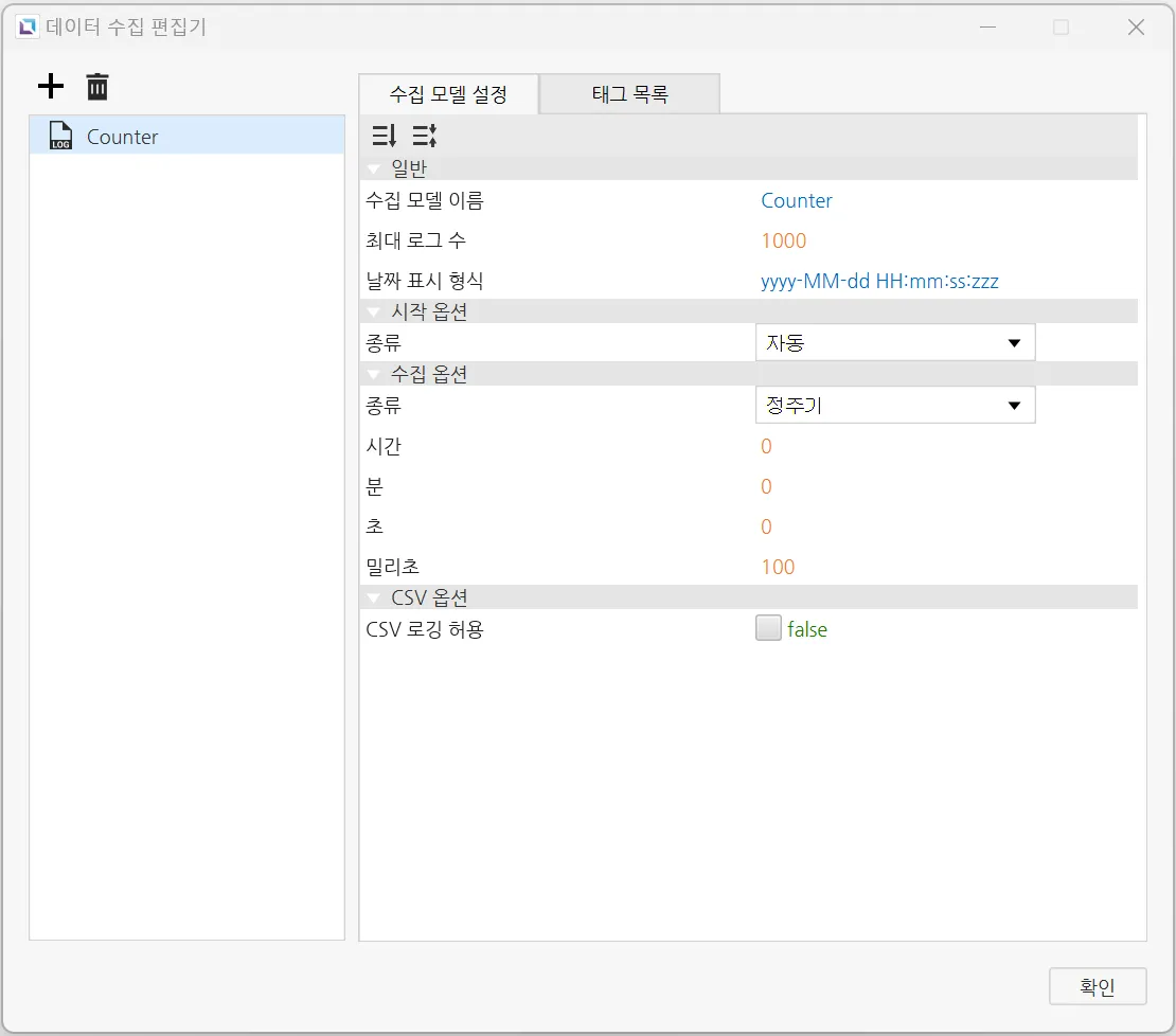 섹션 제목: “데이터 수집 모델 설정 1”- 도구 > 데이터 수집 편집기를 클릭하고 아래와 같은 데이터 수집 모델을 생성하세요. :