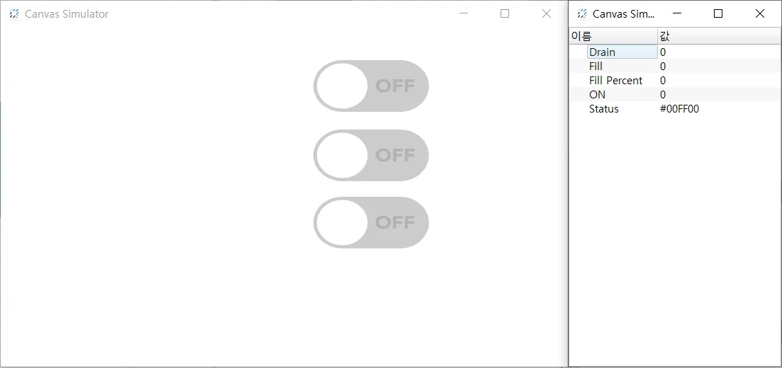 - 탱크가 가득 차면, Fill 버튼을 끄고 Drain 버튼을 토글합니다. 그러면 사각형 (채우기)의 배수가 시작합니다. 물탱크의 채움 정도에 따라 사각형 (채우기)이 노란색과 초록색으로 변경됩니다.