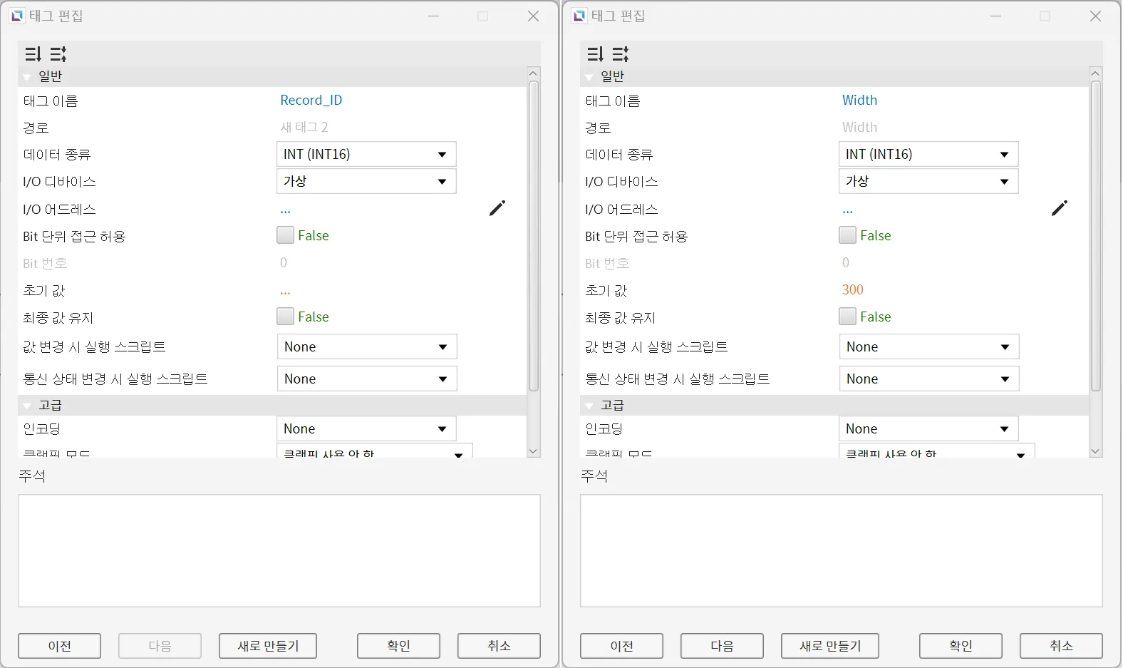 태그명: Width 데이터 종류: INT (INT16) 초기 값: 300