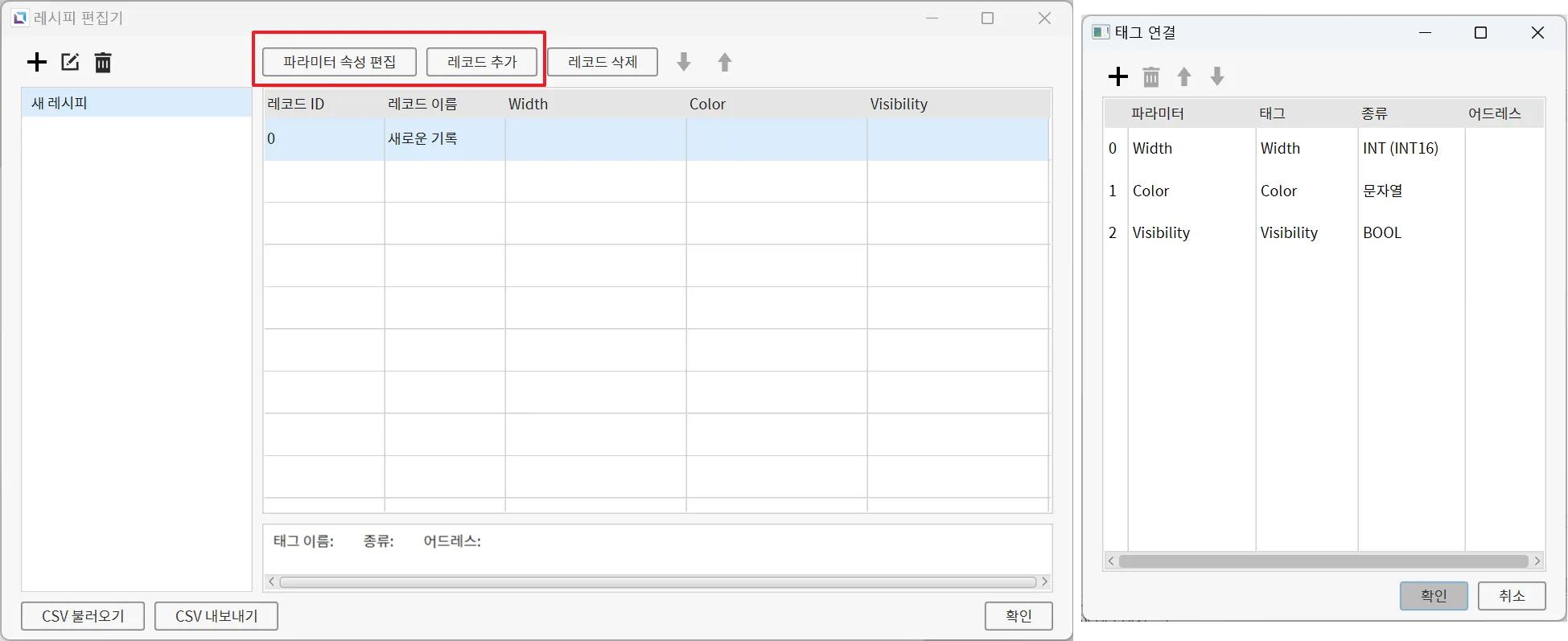- 도구 > 레시피 편집기로 이동하거나 **레시피 편집기 열기…**를 클릭합니다. + 아이콘을 클릭하여 레시피 DB를 새로 생성합니다. 레코드 ID 태그에 앞서 생성한 “Record_ID” 태그를 연결합니다. Handshake는 지정하지 않고 확인을 누릅니다. 생성된 레시피를 선택하고 파라미터 속성 편집을 클릭합니다. 3개의 파라미터를 다음 그림과 같이 생성한 뒤, 레코드 추가 아이콘을 클릭하여 레코드를 생성합니다.