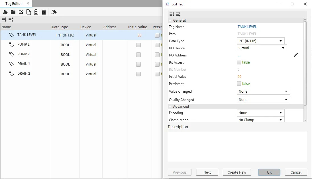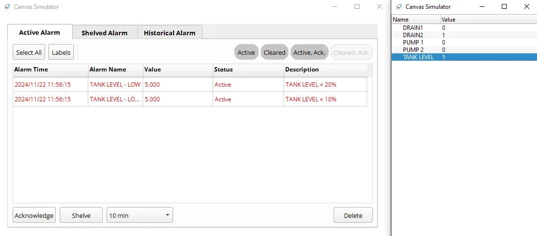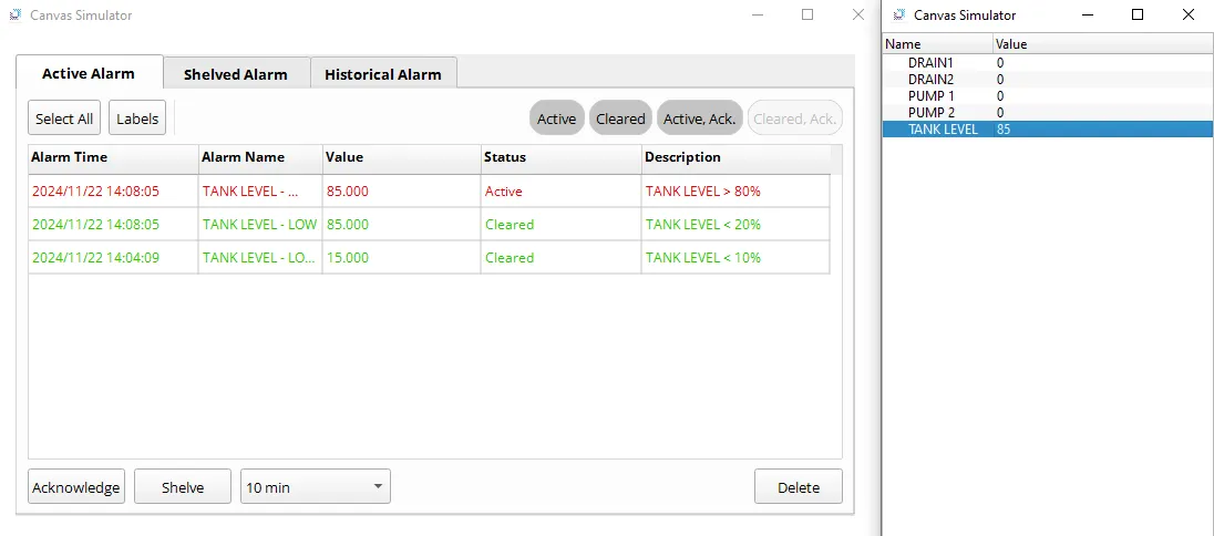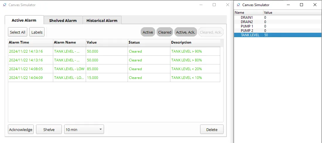 - Setting the TANK LEVEL to 50 will resolve all alarms, resetting tags DRAIN 1 and DRAIN 2 to 0 (false).