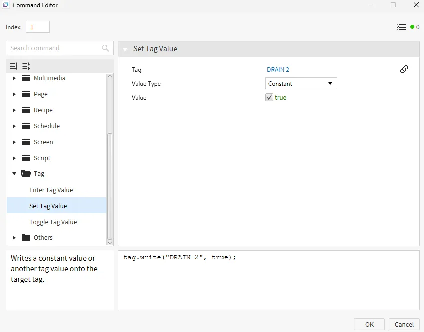 Select Add New Command. Use the Set Tag Value command, assigning it to the DRAIN 2 tag. Set the value to true.