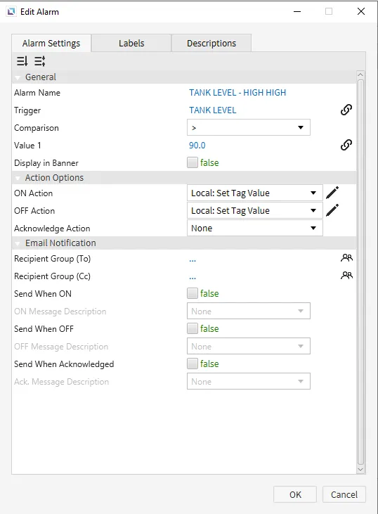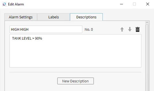 Within the TANK LEVEL - HIGH HIGH Edit Alarm window, navigate to the Descriptions tab and click New Description. Type HIGH HIGH in the title field and TANK LEVEL > 90% in the body field and press OK.