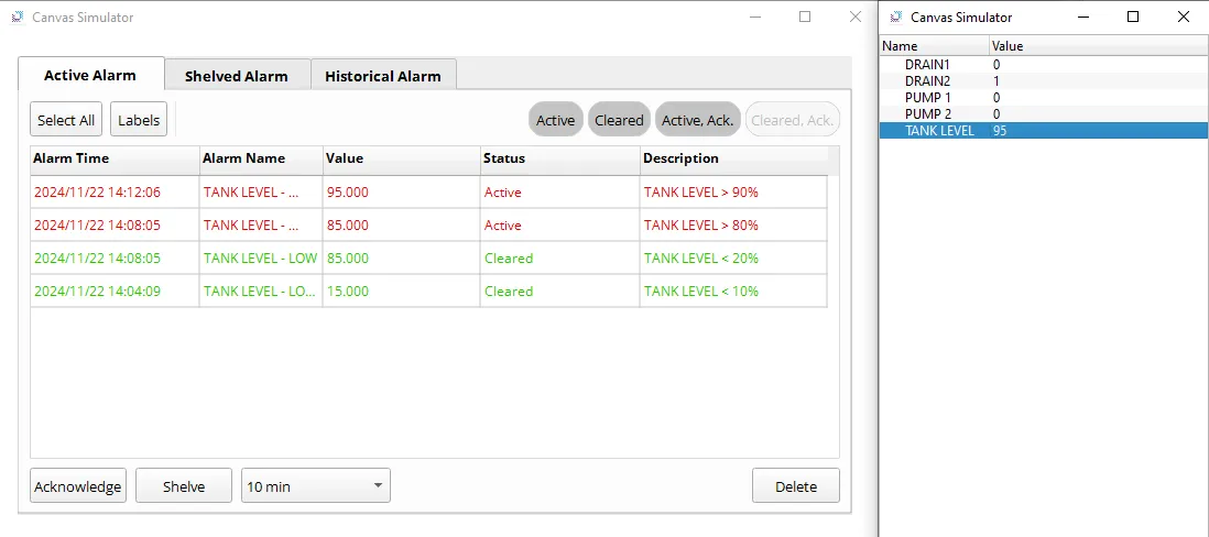 - Setting the TANK LEVEL to 95 will trigger the TANK LEVEL - HIGH HIGH alarm, setting the tag DRAIN 2 to 1 (true).