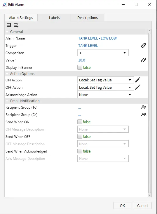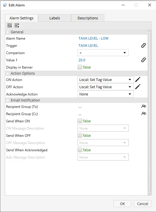 Section titled “Alarm Configuration”- Click Tools > Alarm Editor to bring up the Alarm Editor window. Configure the following alarms for the TANK LEVEL tag: