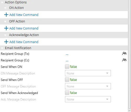 Section titled “Alarm Actions”Users can trigger actions in the program based on alarm statuses. In the Alarm Settings tab of the Edit Alarm window, the user can select the event of the alarm to which an action will be added under the Action Options. The ON Action will trigger an action when the alarm comparison becomes true, the OFF Action will trigger an action when the alarm comparison becomes false, and the Acknowledge Action will trigger an action when the user acknowledges the alarm.