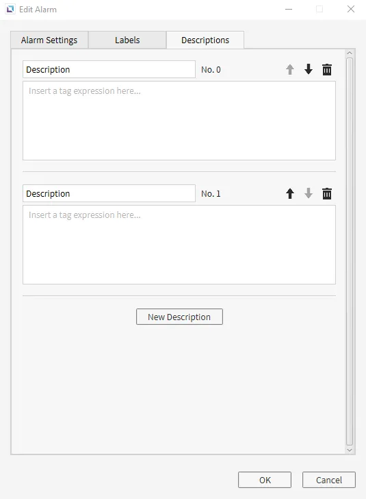 Section titled “Descriptions”In the Descriptions tab, clicking New Description allows users to create tag expressions for the current alarm. Tag expressions are descriptions that can be added in a new column of an Alarm Summary object and will also show in a generated CSV file. Descriptions will be numbered and can be re-ordered after creation. They will be part of the alarm row when the corresponding alarm is triggered. This is similar to how interest tags are displayed in XpanelDesigner, but a description will be shown here instead of a tag value.