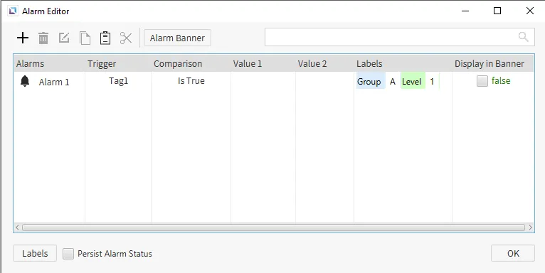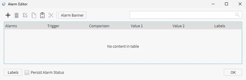 Section titled “Alarm Editor”Click Tools > Alarm Editor to bring up the Alarm Editor window, as shown below: