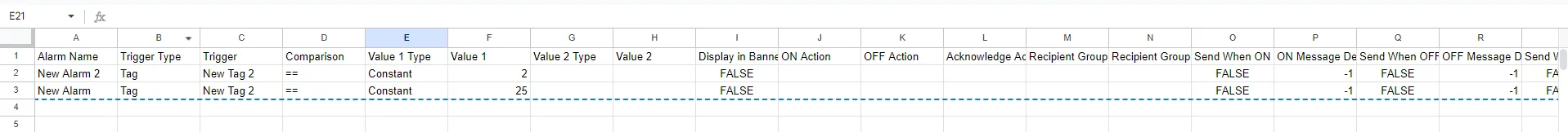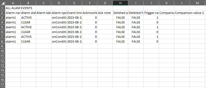 Paste ([Ctrl] + [V]) the contents directly into a spreadsheet. Each column stores a different alarm attribute. These alarm attributes match the ones described in the Edit Alarm window. A detailed description of the alarm attributes and their intended functions can be found here.