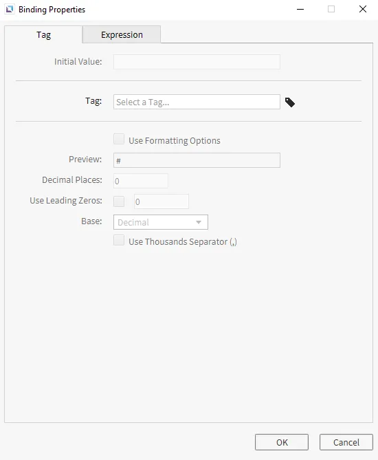 Another way to set conditions is by using expressions. The available expressions consist of scaling a tag value, using a Boolean value, or a condition map, and users are also allowed to create custom expressions. These conditions can be set by clicking on the Expression tab inside the Binding Properties window.