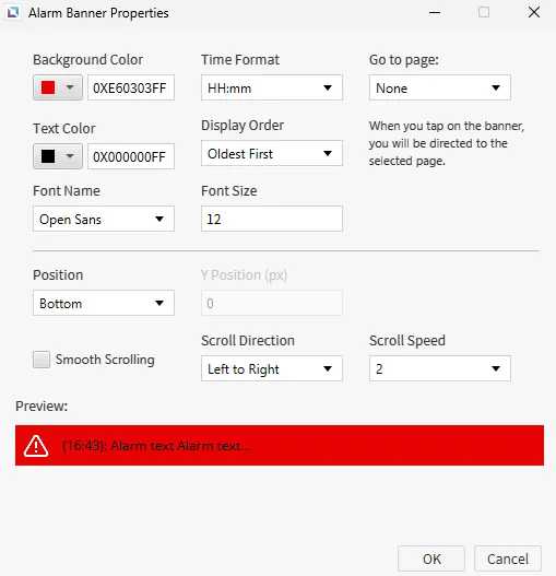 The Alarm Banner Properties window allows users to change the color of the banner, text, font, size, time format, display order, ability to open a page, scrolling functionality, and banner settings. At the bottom of the window, a preview is displayed. If a page is selected under the Go to page: field, tapping anywhere on the banner will open the selected page, where an Alarm Summary object can be shown to display all active, shelved, and historical alarms.