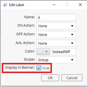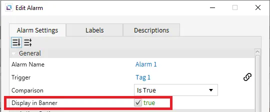 To add alarms to the banner, select the Display in Banner option when creating or editing an alarm or label. When selected, any alarm or alarm under a label, with the option selected, will display on the Alarm Banner when active.