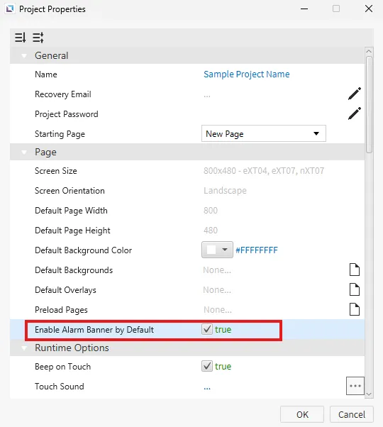 Another option is in the Project Properties window. Select Enable Alarm Banner by Default to display the alarm banner on all pages.