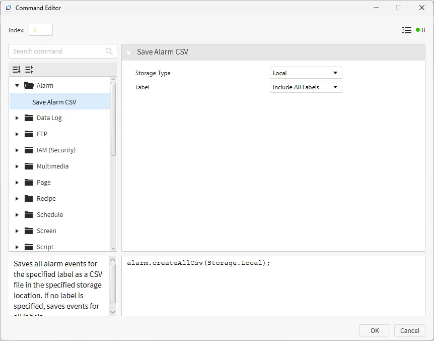 A CSV file can be created in two ways: creating a command set to Save Alarm CSV or creating a script that calls either of two functions: alarm.createCsv(String label, Storage type); or alarm.createAllCsv(Storage type);. The user can specify the storage location and labels to be saved.