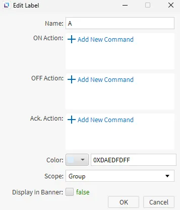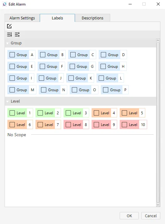 Section titled “Labels”The Labels tab allows users to change groups and levels for alarm organization. There are two default scopes to select from: group and level. Additional labels and scopes can be created by clicking the Edit Labels button. One alarm may have multiple groups and level labels, and various alarms can have the same label. Groups or Levels can be selected by left-clicking the already created label and deselected by clicking the x icon next to a selected label. An example of selected labels and the icon to deselect them is shown below: