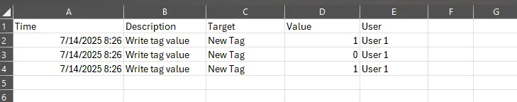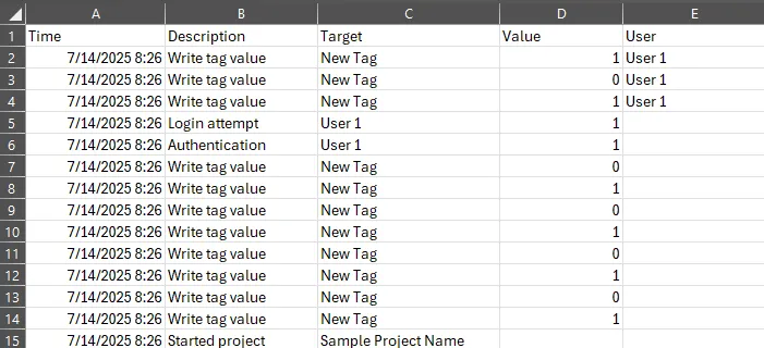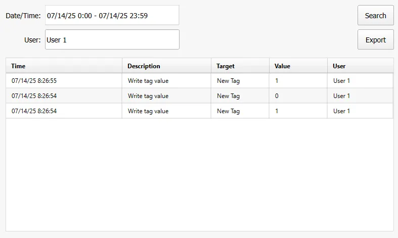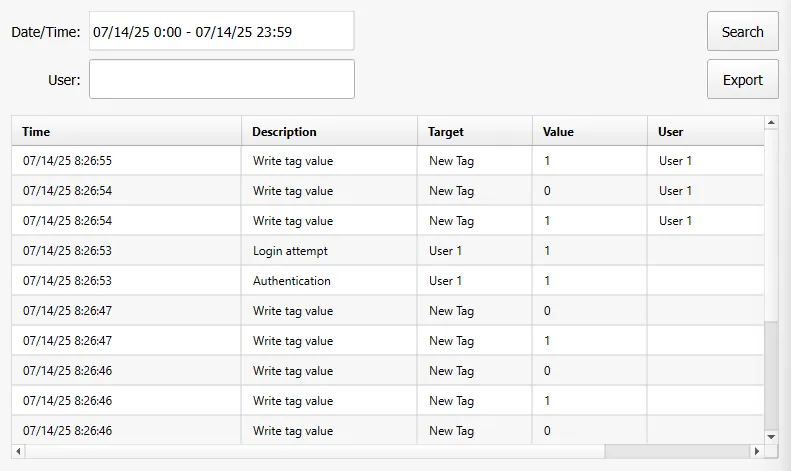 Section titled “Audit Log Feature Description”Audit logs keep track of user actions that occur during runtime. Any user activity, such as changing a tag value or logging in, will be tracked in the audit log. The audit log table shows all of the actions users take in the form of time, description, target, value, and user.