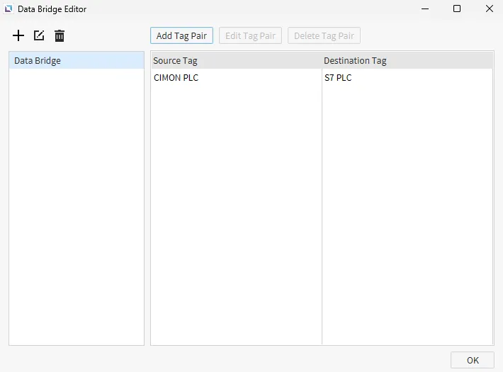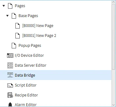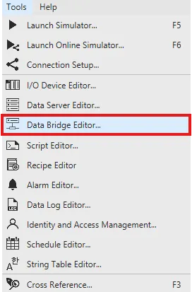 Section titled “Data Bridge Configuration”- Click Tools > Data Bridge Editor or click the Open Data Bridge Editor icon on the toolbar.