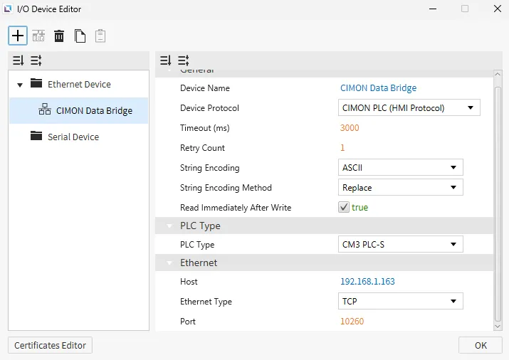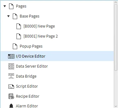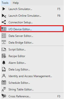 Section titled “I/O Device Configuration”- To enable communication between the HMI and the PLCs, the devices must be registered in Canvas. Open the I/O Device Editor by selecting it from Tools > I/O Device Editor or click the Open I/O Device Editor icon on the toolbar.