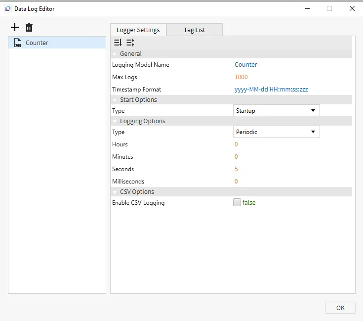 Section titled “Data Logger Model Configuration 1”- Create the following data logger model under Tools > Data Log Editor: