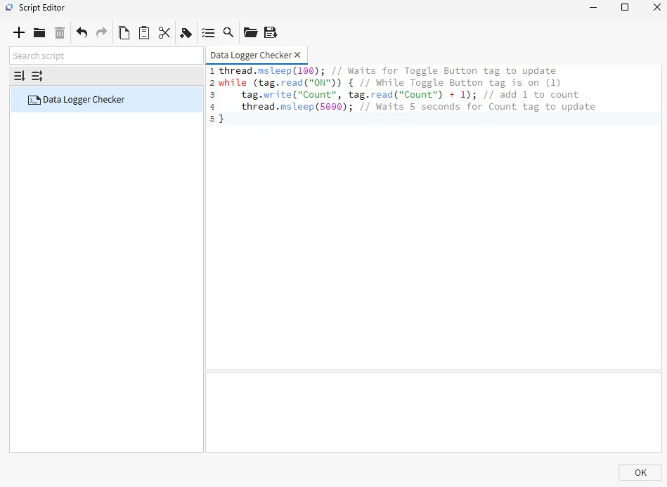 thread.msleep(100); // Waits for Toggle Button tag to updatewhile (tag.read("ON")) { // While Toggle Button tag is on (1) tag.write("Count", tag.read("Count") + 1); // add 1 to count thread.msleep(5000); // Waits 5 seconds for Count tag to update}