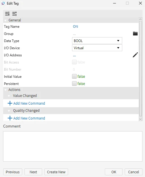 Once placed, click and hold the ON tag and drag it to the Toggle Button to bind it. Or, manually bind the ON tag to the Toggle Button's Value property.
