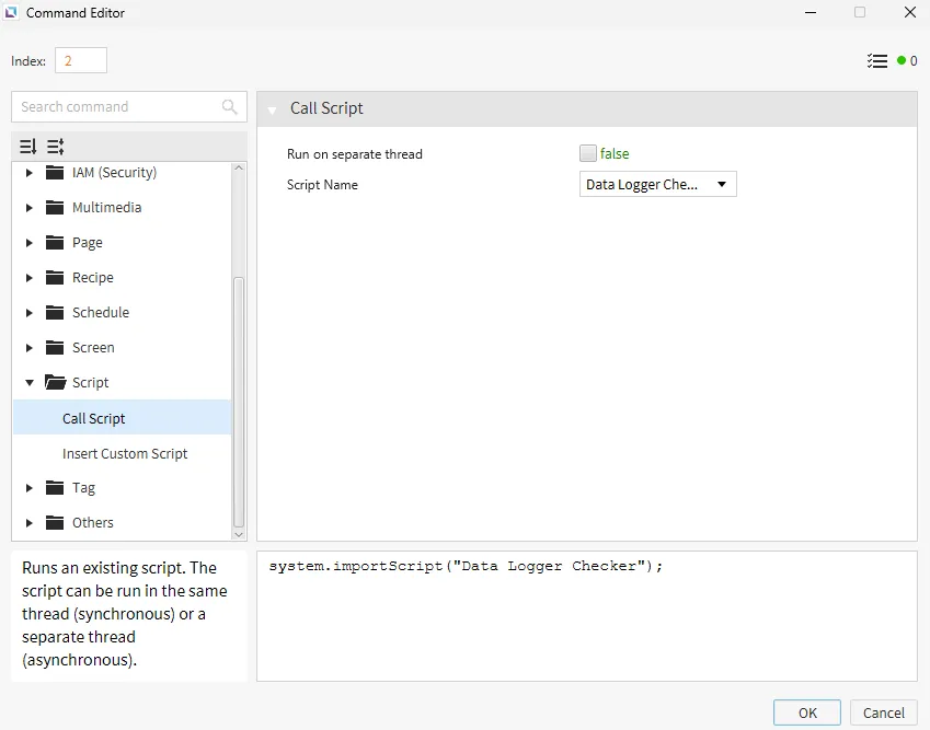 - On the Canvas page, click on the Toggle Button. Create a new On Press command under the Actions section. Add the Call Script command with the script type set to Data Logger Checker.