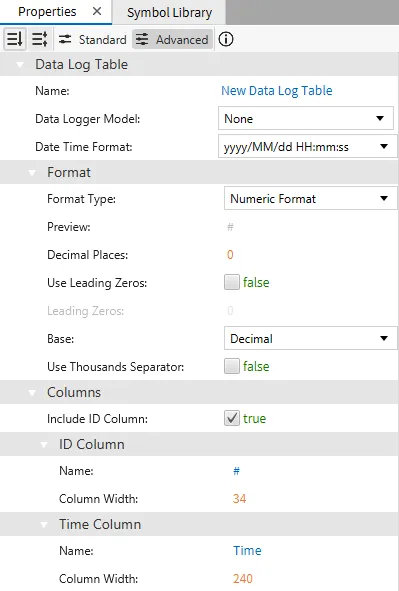 Section titled “Properties”The Data Log Table object can be customized based on specific properties.