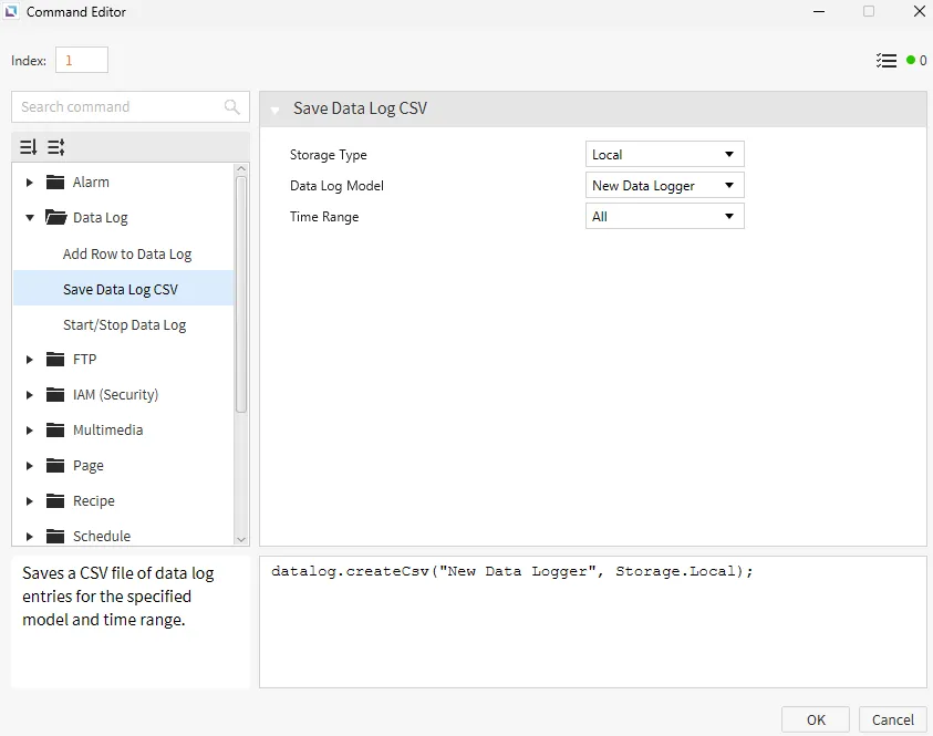 Section titled “CSV Generation”The Data Log Table can be exported to a CSV for record keeping. The CSV file can be stored using a USB, SD card, File Transfer Protocol (FTP), or local memory on the Xpanel.1