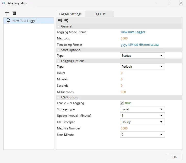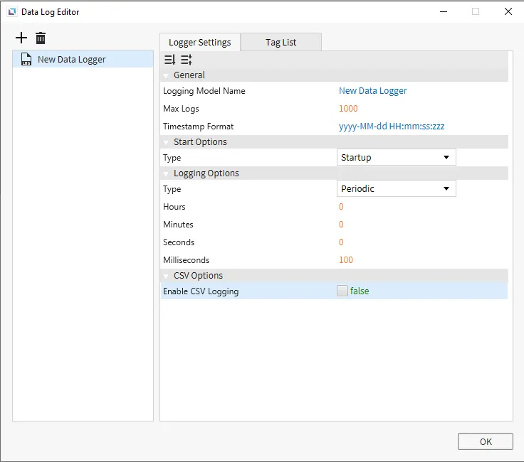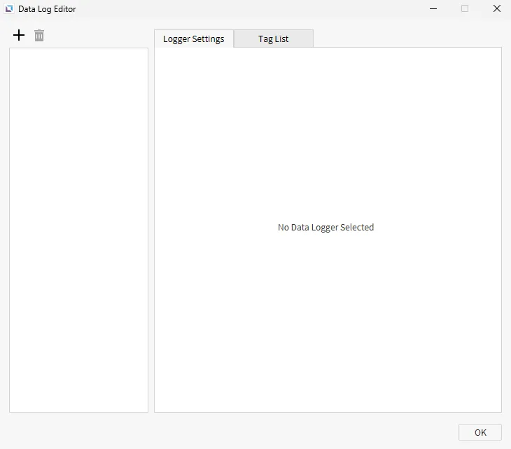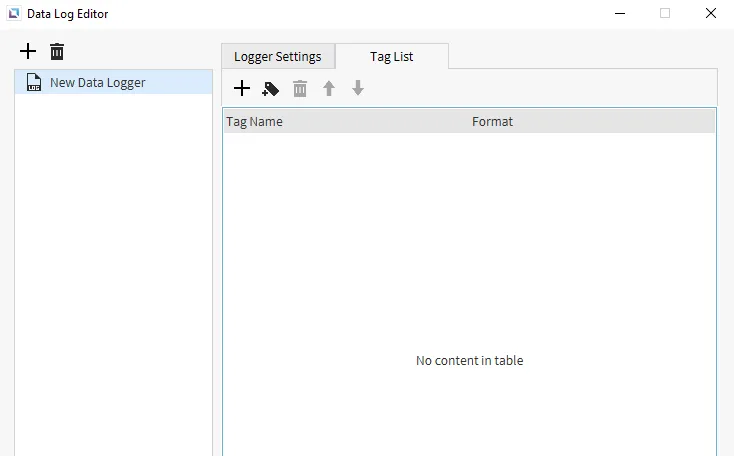Section titled “Data Log Editor”To open the Data Log Editor window, click Tools > Data Log Editor. This window contains the Logger Settings and Tag List tabs. This is where users can create new data logging models, add tags, and edit existing models.