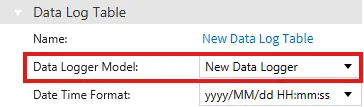 The data log model created in the Data Log Editor must be set under the data logger model property.