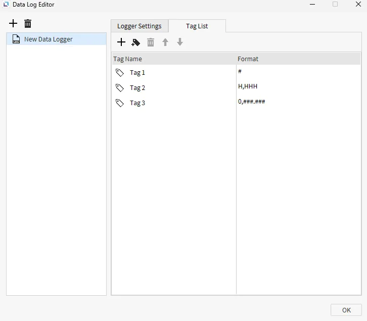 Section titled “Tag List”The tag list tab allows the user to add tags that will be data logged.