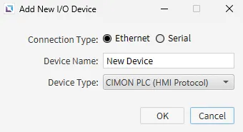 To create a new device, click the + icon to open the Add New I/O Device window. Users can select Ethernet or Serial as the connection type. The device can be named, and the Device Type can be specified. Device Type opens a drop-down of specific devices that Canvas supports communication with.