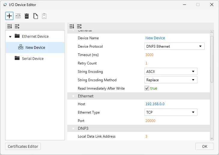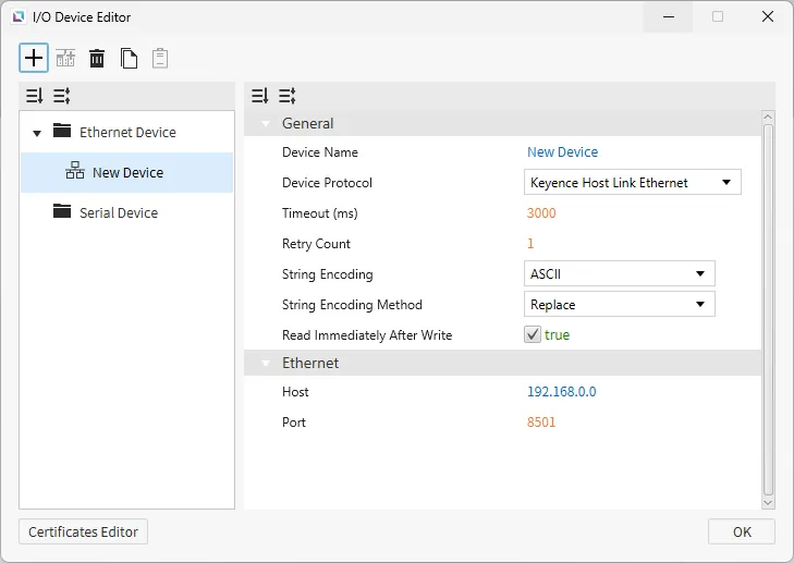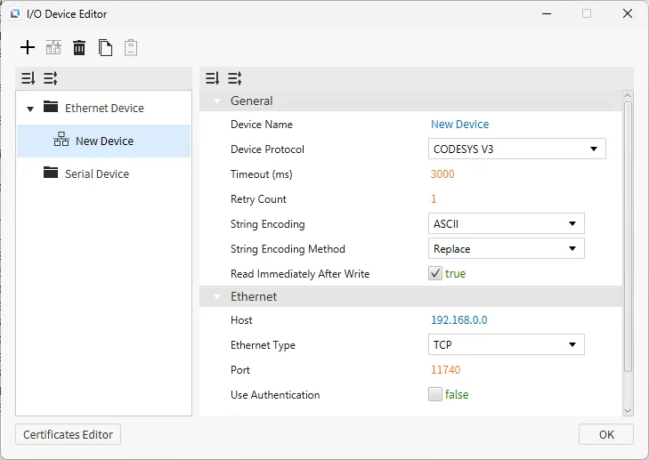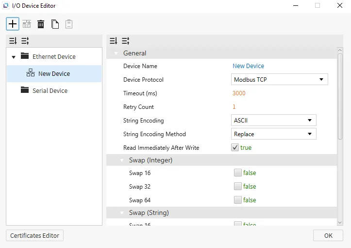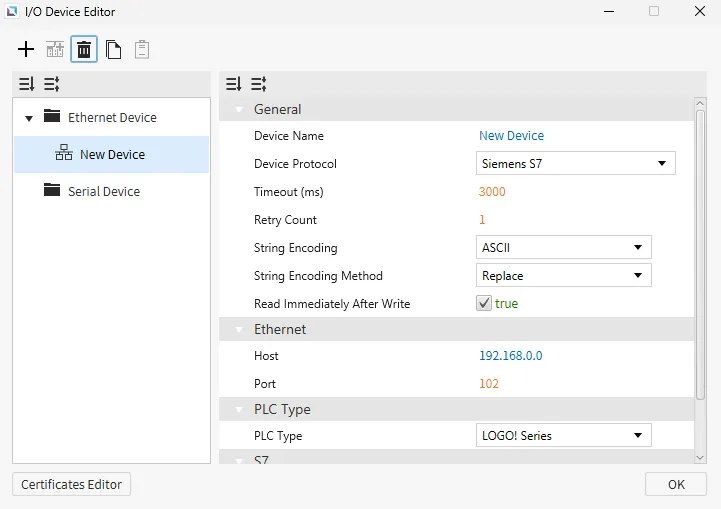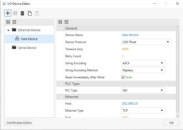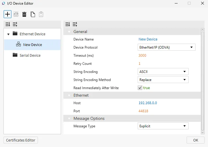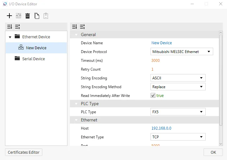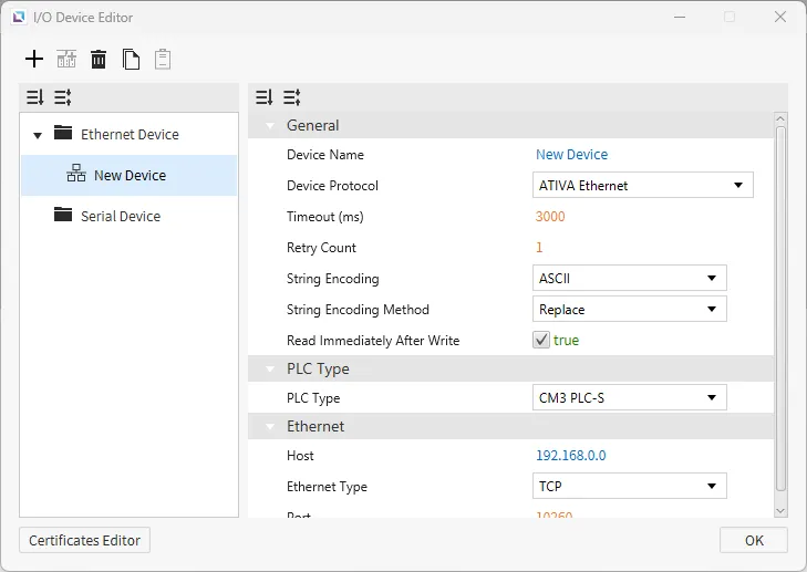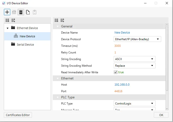 Section titled “Ethernet Devices”Ethernet devices are used when the connection to another device is via an Ethernet connection. Users must input the IP of the device they are connecting to, the Ethernet Type, and the Port. Depending on the selected protocol, users can also set the PLC Type. Users can also select the String Encoding and the String Encoding Method. Other settings, such as the Timeout time and the Retry Count, can be configured. Users will also be able to change the name of the device and the communication protocol.