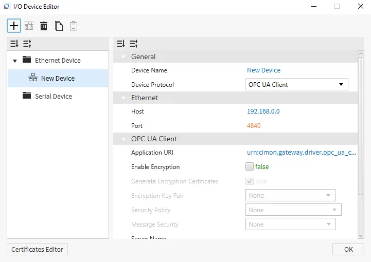 Section titled “OPC UA Client”Canvas supports OPC UA Client as a way to connect to other devices that support this protocol. Users can Enable Encryption and enhance security for their OPC UA Client. Users can also manage specific Security Policies and change the authentication method.