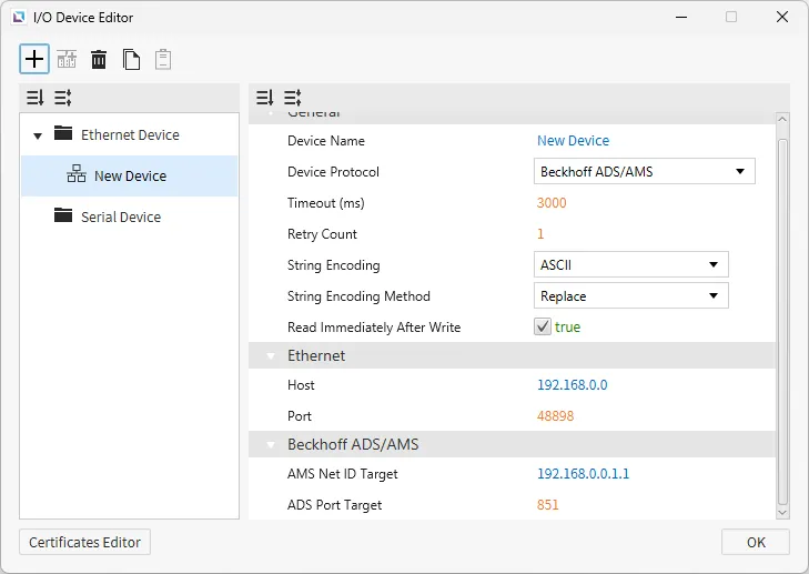 Section titled “Beckhoff ADS/AMS”Canvas supports Beckhoff ADS/AMS as a way to connect with other devices that support this protocol. Users can configure the AMS Net ID Target and ADS Port Target.