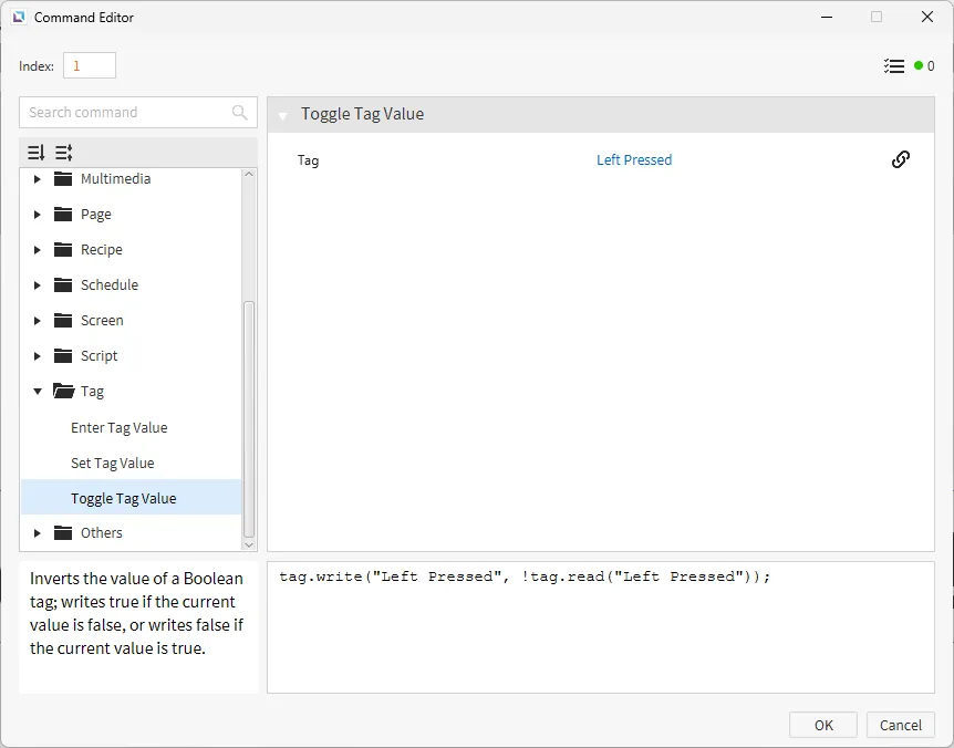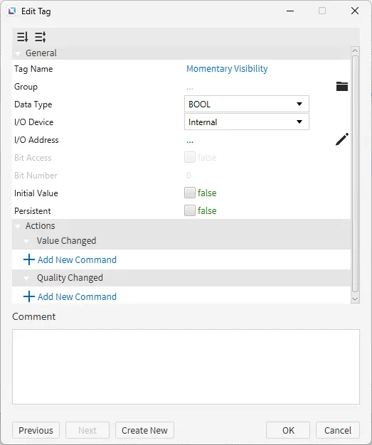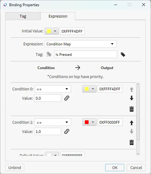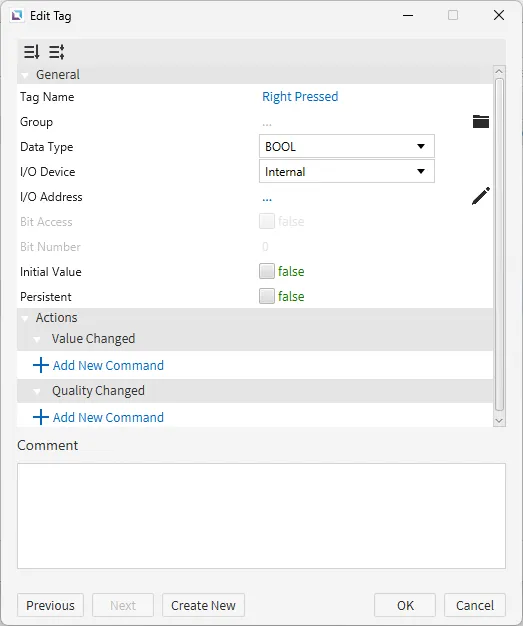 - Smart bind (drag-and-drop) the Is Pressed tag onto the momentary button.