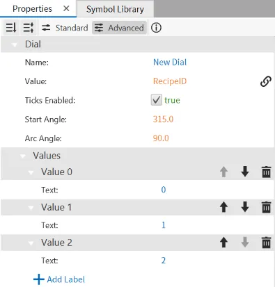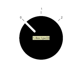 - Insert a dial object. Under the properties of the dial object bind the RecipeID to Value and add a 2 more values to have a total of 3 values. Label each value it's corresponding index value.