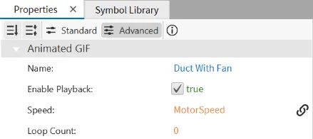 - Navigate to the Symbol Library tab then Animation Library, left-click the drop-down Ducts, add the Duct With Fan object. Select the Duct With Fan object and under it's properties, bind it's Speed to the MotorSpeed tag.